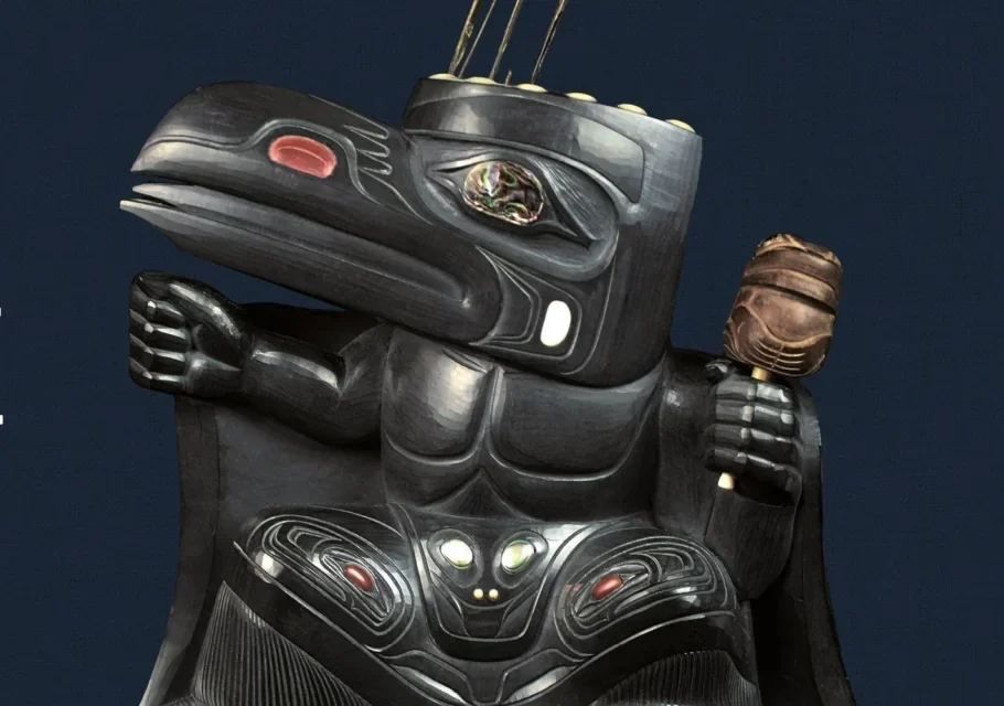 Henderson’s style of deep carving, fluid lines, and dramatic composition, as well as the intricate formline design in black and red paint, is very true to traditional Kwakwaka’wakw design.
