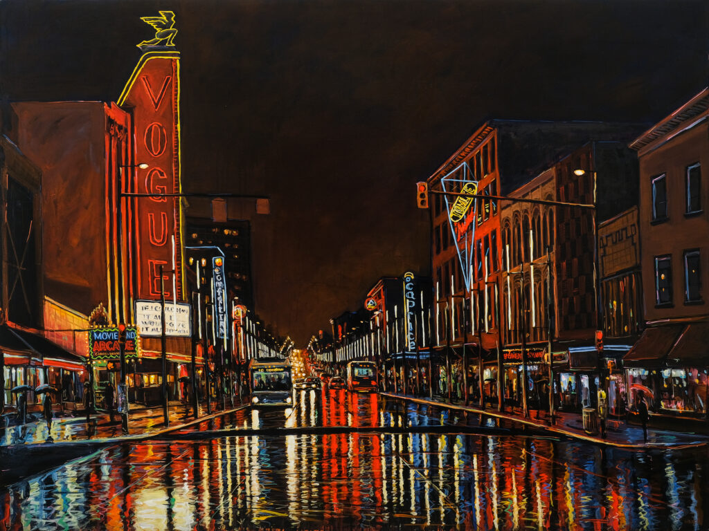 With his newest collection, Close to Home—his first since 2019’s Everywhere From Here—artist David Wilson offers a peek at those final, pre-COVID days. In the poignantly titled “Come Back to Me”, Wilson’s vibrant acrylics capture the Stanley’s grand marquee as it presides over a rain-slicked South Granville Street, still busy with traffic and—typical to the artist’s often-waterlogged […]
