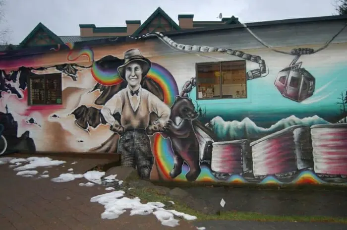 Speaking to the depth of Whistler’s history and culture, this story-focused mural spans the side of the Whistler Museum and Archives. Using Pacific Great Eastern Railway cars as a visual throughline, Kris Kupskay creates a sense of momentum through the years. The central figure, Myrtle Philip, was the founder of Whistler’s first lodge, Rainbow Lodge, and she anchors the narrative. It’s an outstanding example of how a story can be told purely through visuals.