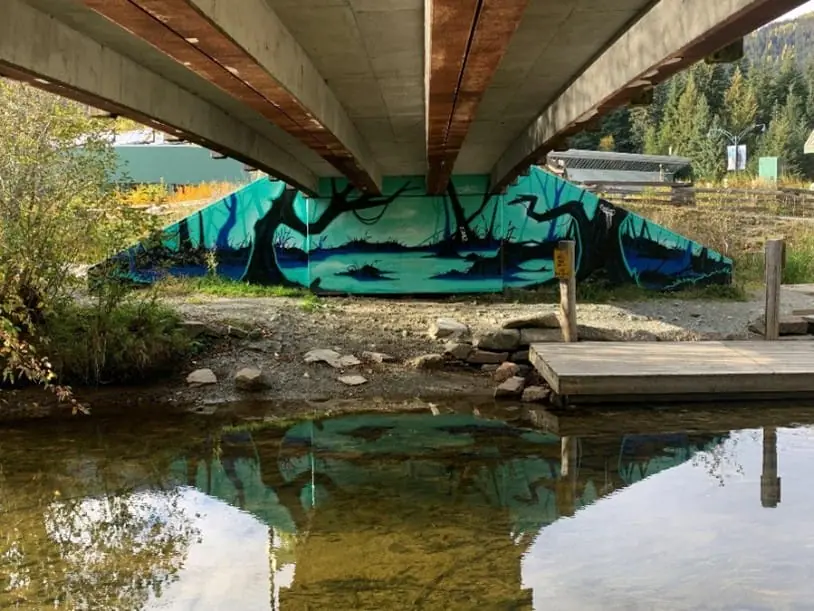 Another mural by Kris Kupskay, this piece is nestled under a creekside bridge and is a hidden gem if there ever was one. Local paddlers know the mural well, spotting it as they pass underneath and pause to admire the unexpected canvas. On bright days, sunlight reflects through the water, creating a tranquil spot that feels both intimate and singular. If you’re looking for an active blend of nature and art, this one definitely deserves a place on your itinerary.