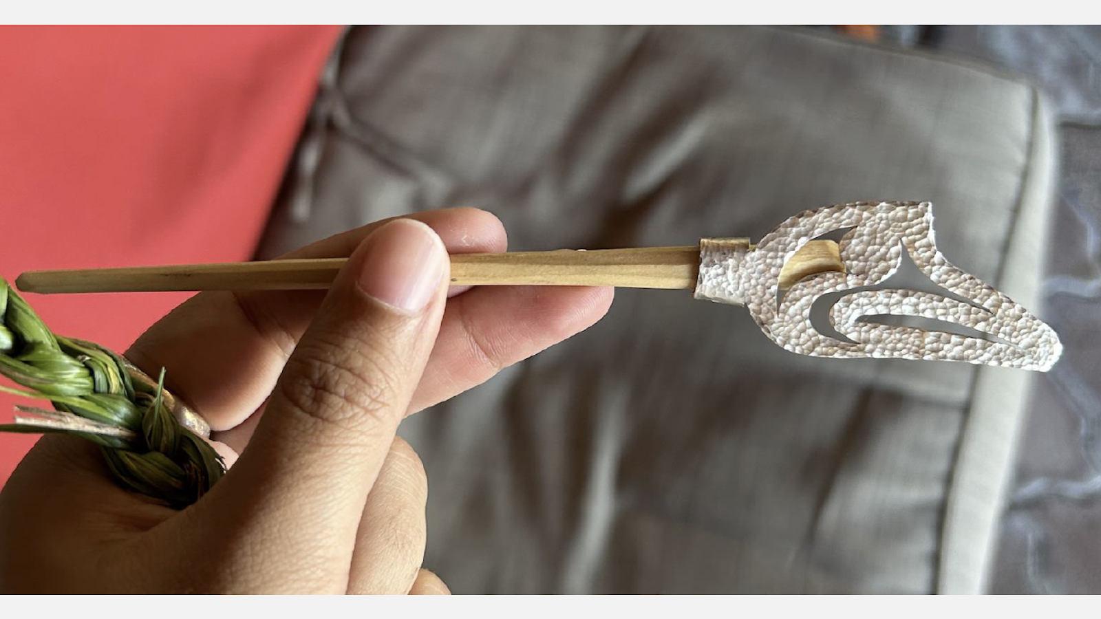 Expanding on her Salish Weaving Residency at the Surrey Art Gallery in summer 2023, Picha’s new exhibition brings together a dynamic body of work that spans carving, sound elements, and a hand-spun, hand-woven Salish blanket. For this collaborative piece, Picha invited mentors, friends, colleagues, family, and other significant figures in her life to contribute blanket pins. Traditionally used to fasten woven garments worn in ceremony and as regalia, the pins become both functional and symbolic, anchoring the work in family, community, and shared history.